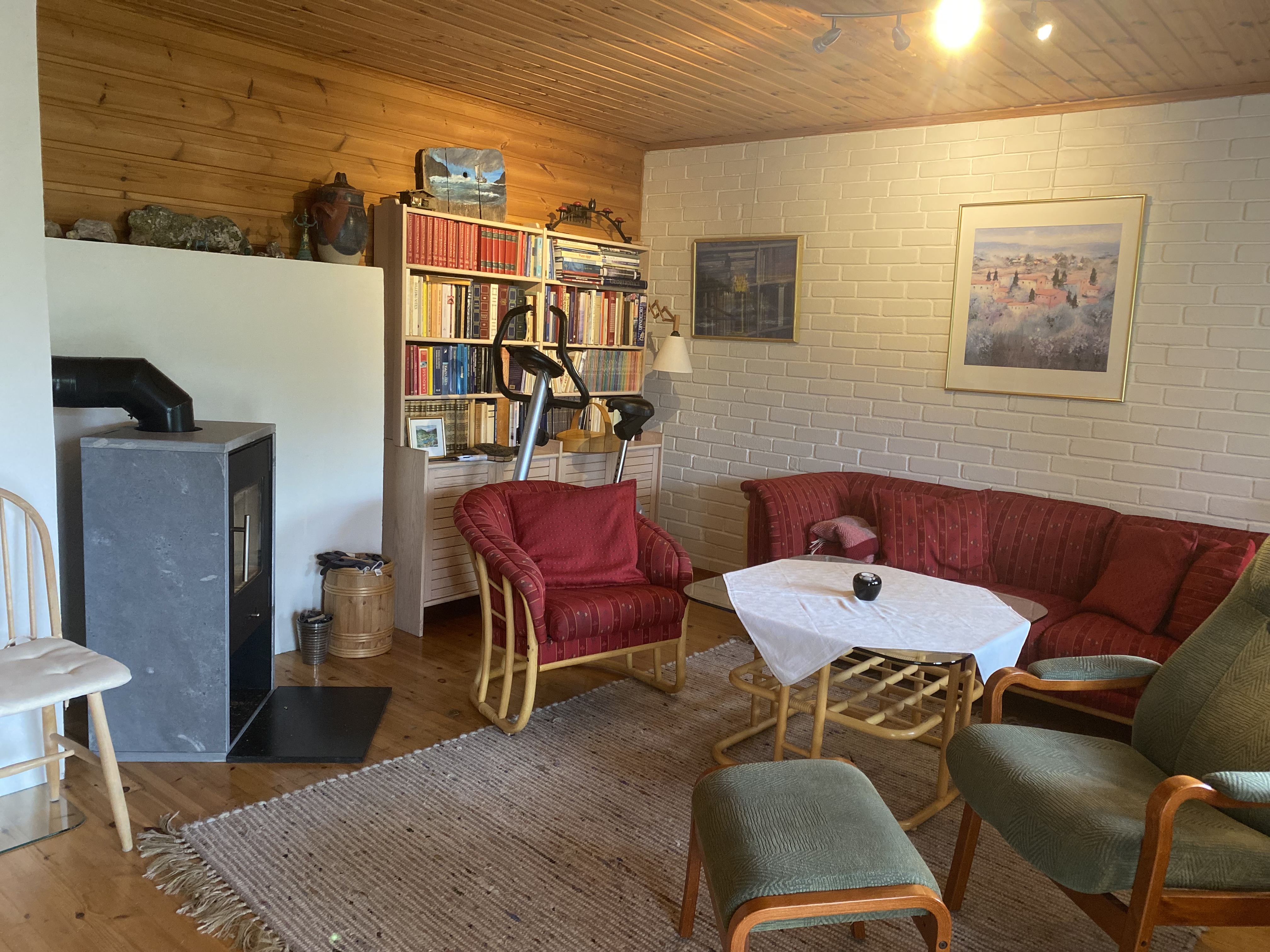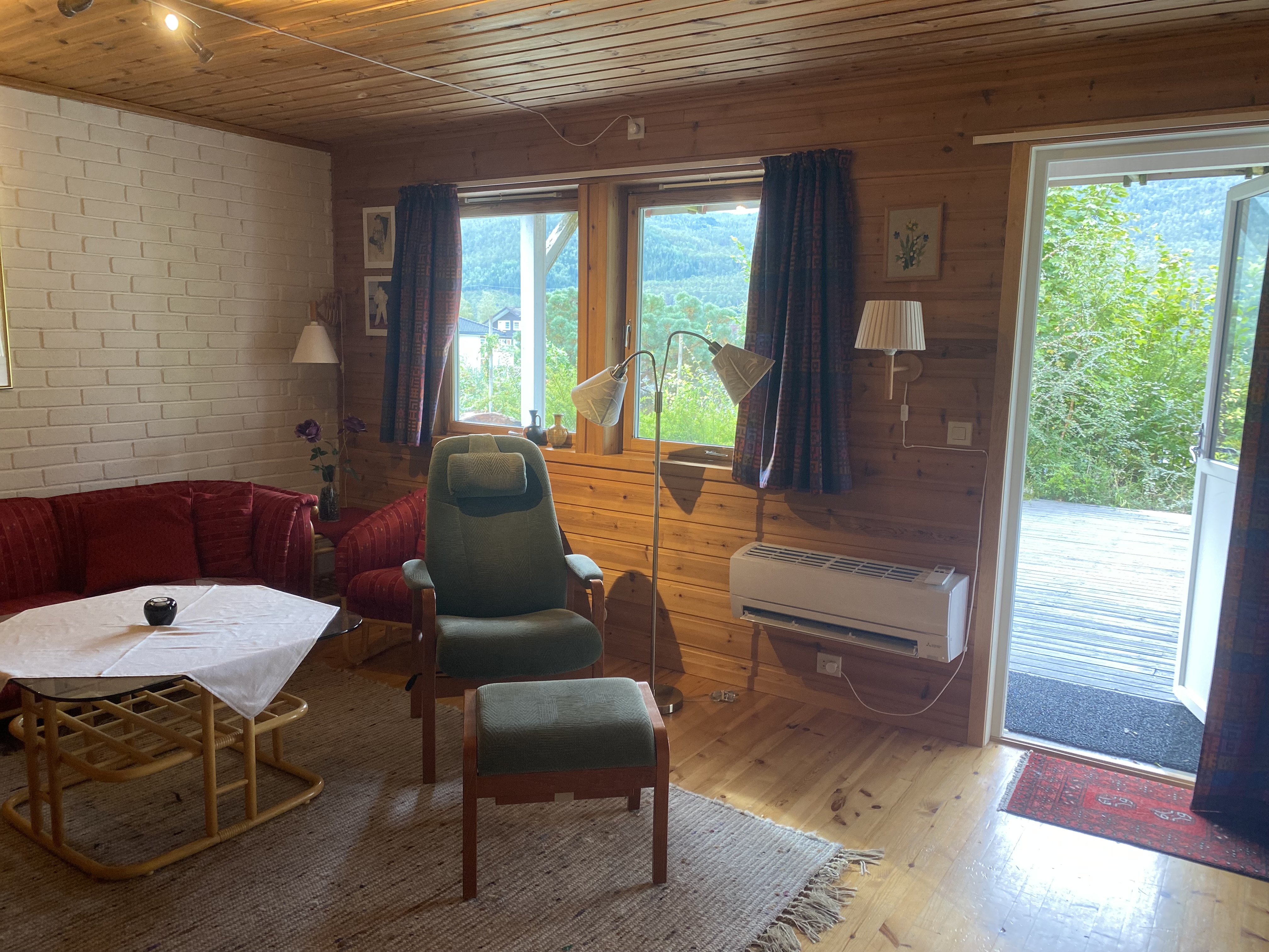 Stove med sofa og kvilestolar. Varmepumpe og terrasse. Bad med dusj og badekar.